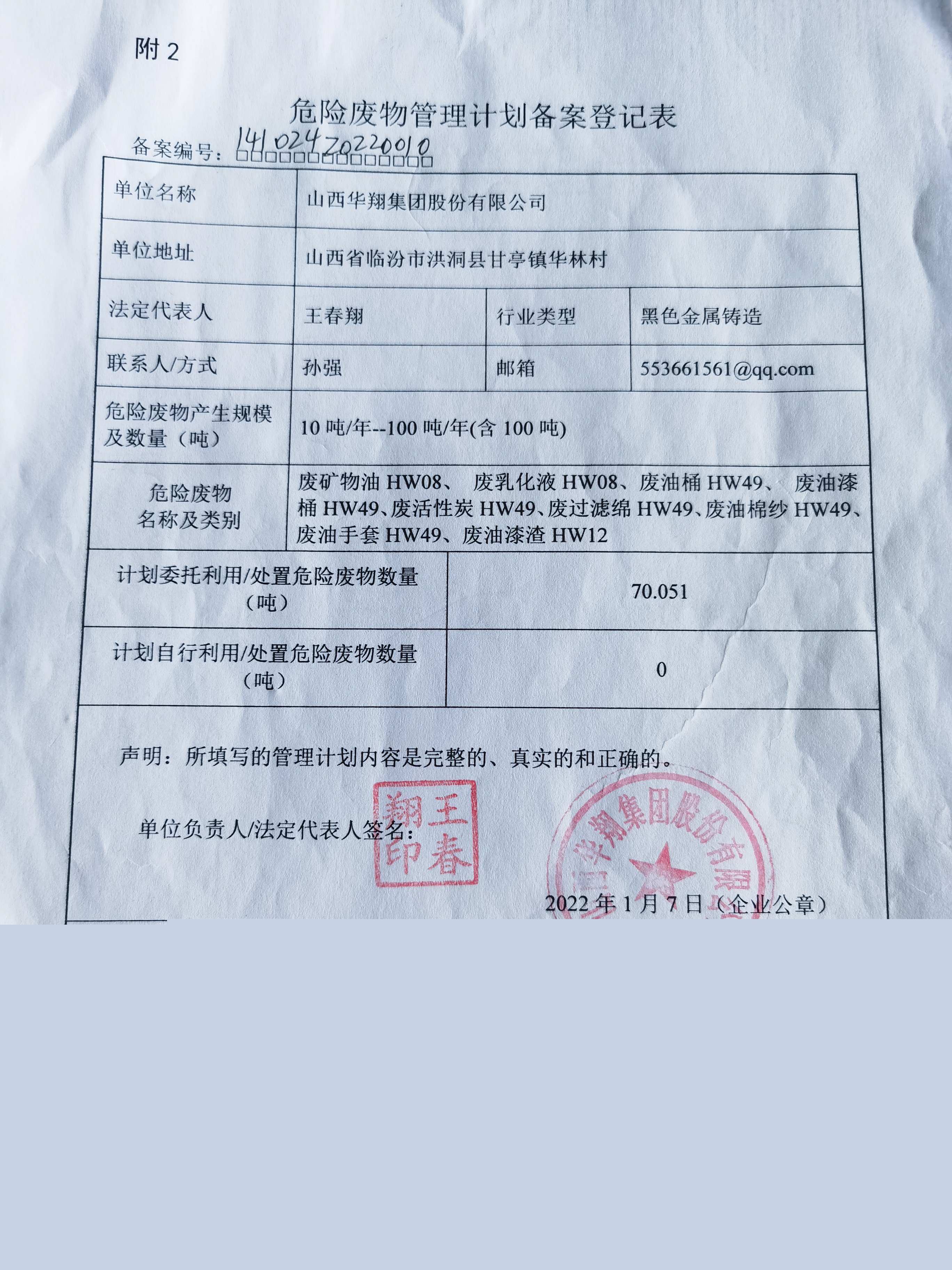山西華翔集團(tuán)股份有限公司危險廢物污染防治責(zé)任信息公示
